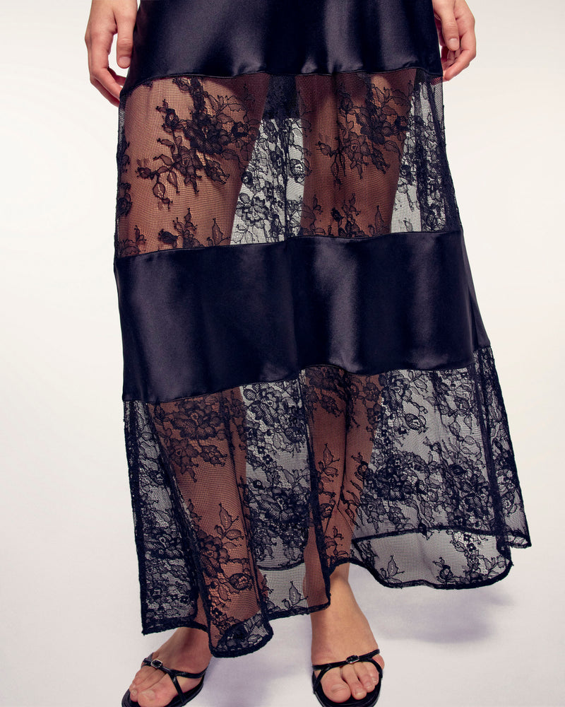 Confectionnée en 100% Soie pour un tombé fluide, cette pièce affiche une coupe longue et slim. Son design est audacieusement structuré par des larges chevrons en dentelle, apportant texture et sophistication.