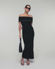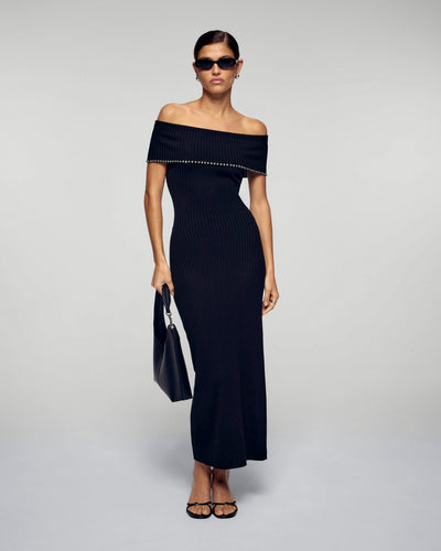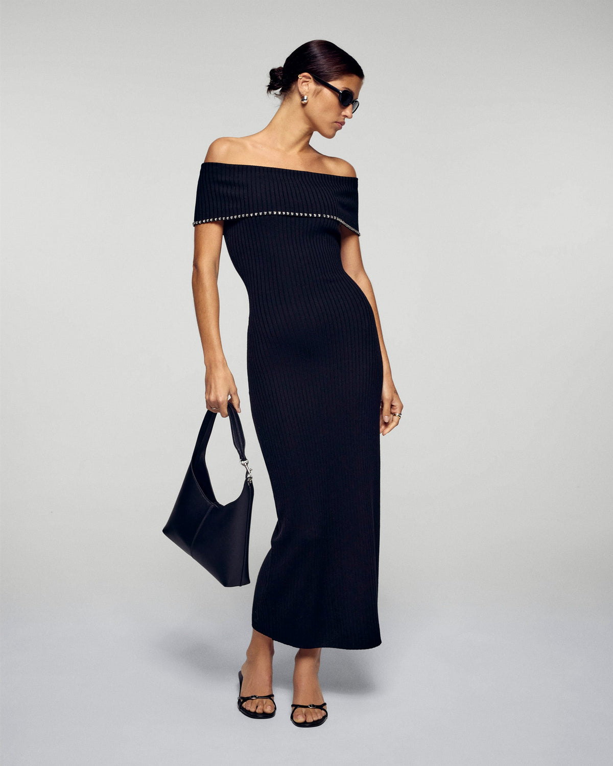 Élégante et sensuelle, cette robe longue en laine mérinos épouse le corps avec souplesse, et apporte une silhouette sophistiquée par son encolure bardot ornée de strass.