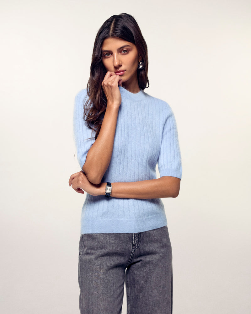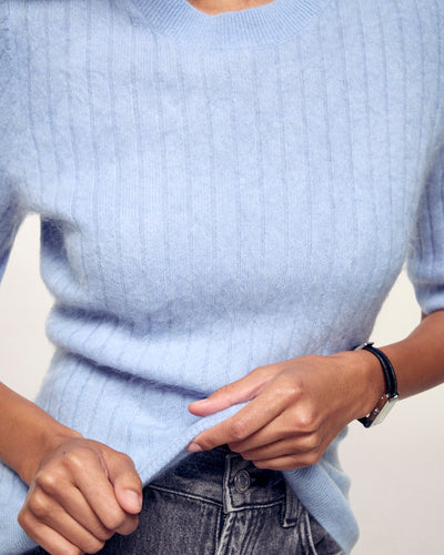 Top Manches Courtes Rayures Cachemire brossé - 100% Cachemire - Vérifié GCS - Baby Blue